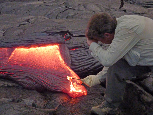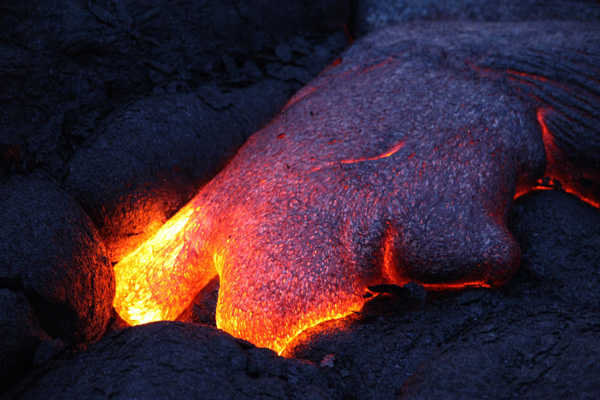 Il arrive parfois que des coulées pahoehoe progressent plus lentement et développent de petits appendices bulbeux baptisés « orteils (ou doigts) de pahoehoe ». Personnellement, je les ai baptisés « doigts de Pele, par référence à la déesse du feu hawaiien. La photo ci-dessous montre la formation d’un de ces ‘doigts’. Au fur et à mesure que la lave refroidit et que sa surface devient plus visqueuse, d’autres sorties de lave apparaissent, qui contribuent à faire avancer la coulée.