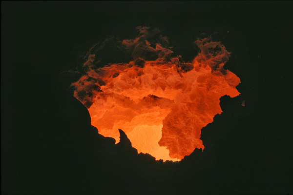 My observations concerning the cooling of lava correspond with the ones I made in 2006. After flowing over a few tens of centimetres, lava began to crust over while forming coiled ropes. The surface was hard enough for a man to walk on after a few minutes, although lava was still flowing below the crust and emerging as one or several lobes at the front of the flow.