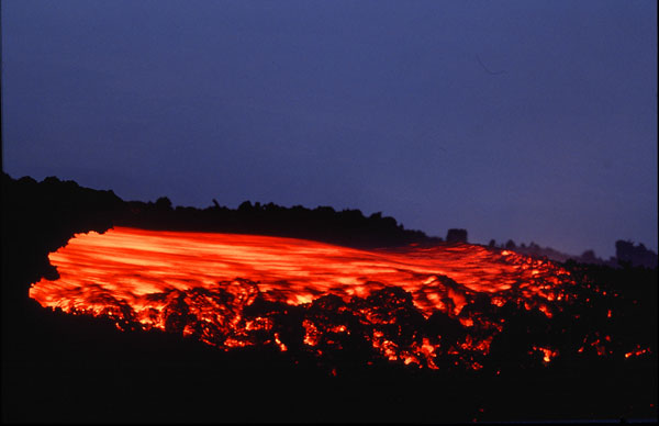 Il arrive parfois que des coulées pahoehoe progressent plus lentement et développent de petits appendices bulbeux baptisés « orteils (ou doigts) de pahoehoe ». Personnellement, je les ai baptisés « doigts de Pele, par référence à la déesse du feu hawaiien. La photo ci-dessous montre la formation d’un de ces ‘doigts’. Au fur et à mesure que la lave refroidit et que sa surface devient plus visqueuse, d’autres sorties de lave apparaissent, qui contribuent à faire avancer la coulée.