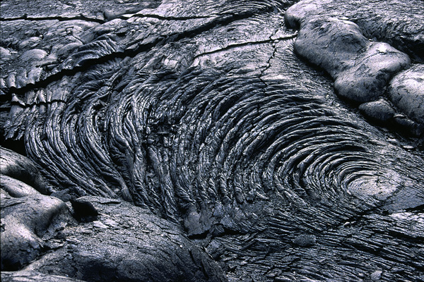 Pahoehoe lava can take several different forms. As its smooth surface cools to turn to a dark grey colour and become less fluid and more viscous, it behaves more like a plastic substance than a truly liquid one. Besides, as lava continues to flow underneath this plastic skin, the surface wrinkles into a form that resembles coiled rope. That’s why such a surface is aptly called « ropy pahoehoe ».
