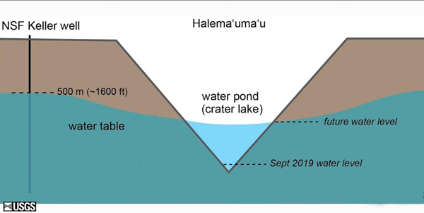 Halemaʻumaʻu has since been filled by lava, and groundwater in the Kilauea summit is significantly deeper than the current crater floor, well beneath the surface. So, though another water lake is not out of the question in Kilauea’s future, HVO is not expecting one any time soon.