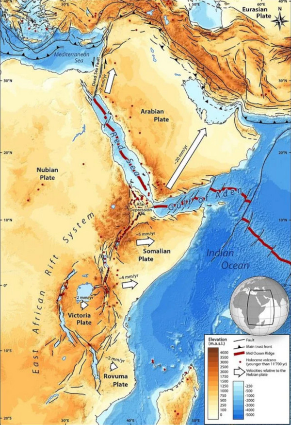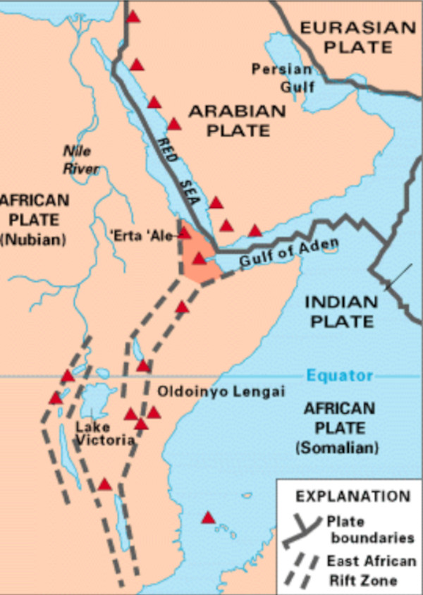 L’Afar est le point de rencontre des plaques arabique, nubienne et somalienne. Chacune s’écarte dans sa direction respective, ce qui laisse place à une brèche de plus en plus grande sous le Triangle de l’Afar. À terme, la croûte deviendra si fine à cet endroit que la surface s’abaissera sous le niveau de la mer, créant un nouveau bassin océanique au large de la mer Rouge.
