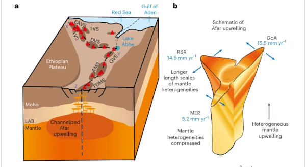 In Ethiopia, the Afar region lies above the junction between three tectonic plates, and scientists have discovred that molten magma pounds the planet’s crust from below. In that part of the world,, the continent is slowly being torn asunder in the early formation stages of a new ocean basin. By sampling the chemical signatures of volcanoes around this region, a scientific team from Swansea University and the University of Southampton in the UK hoped to learn more about this wild process. They found that the mantle beneath Afar is not uniform or stationary ; it pulses, and these pulses carry distinct chemical signatures. The study, entitled « Mantle upwelling at Afar triple junction shaped by overriding plate dynamics », was published in Nature Geoscience.
