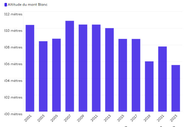 On remarque que l’altitude maximale du Mont Blanc a été atteinte en 2007, année où la montagne est repassée au-dessus de 4810 mètres. Le graphique montre que l’altitude décroît de manière plus ou moins régulière par la suite, jusqu’à aujourd’hui. Luc Moreau fait remarquer que la baisse d’altitude « n’est pas représentative du réchauffement climatique ». Cette donnée offre seulement « une indication du changement climatique, mais ne peut pas être interprétée comme son résultat ». Le glaciologue explique que la mesure du sommet alpin est faite à un instant T et qu’elle aurait pu être différente quelques jours plus tard, en fonction de la météo et des chutes de neige. Il faut toutefois ajouter que le manque de précipitations depuis deux hivers et les deux canicules de 2022 et 2023, expliquent l’altitude mesurée qui répond au climat que l’on a eu depuis deux ans.