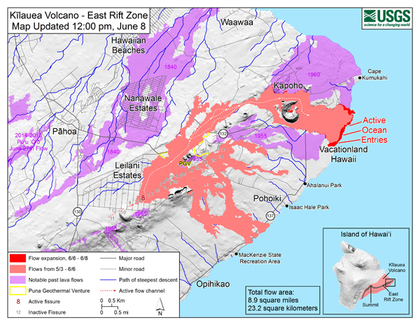 Lava continues to erupt profusely from Fissure 8. No significant changes have been observed in the flow field which continues to supply lava to the ocean entry at Kapoho. Heavy gas and steam emissions are noted at fissures 9 and 10, but lava emission is occurring only at Fissure 8.