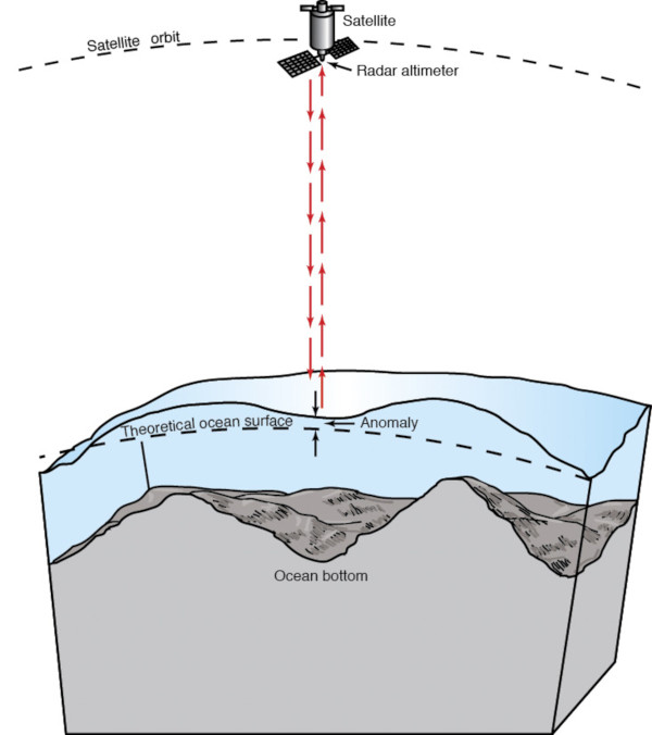 Pour repérer les reliefs sous-marins, SWOT mesure la hauteur de la surface de l’océan. Malgré les apparences, cette surface n’est pas plate. En effet, l’attraction gravitationnelle des structures sous-marines telles que les collines et les volcans fait que l’eau s’accumule et s’étale à leur sommet. Les variations de hauteur de la surface de la mer indiquent donc ce qui se trouve en profondeur.