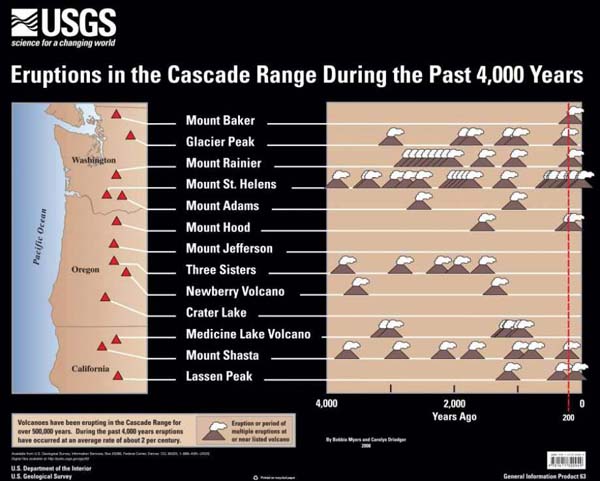 S’étirant du sud de la Colombie-Britannique jusqu’au nord de la Californie, en passant par les Etats de Washington et de l’Oregon, la Chaîne des Cascades longe la côte ouest de l’Amérique du Nord. Elle comprend de nombreux volcans potentiellement actifs, dominés par les 4 392 m du Mont Rainer. Toutes les éruptions des États-Unis contigus au cours des 200 dernières années ont eu lieu sur la Chaîne des Cascades. Les deux plus récentes ont secoué le Lassen Peak de 1914 à 1921, et le Mont St. Helens en 1980. D’autres éruptions, de moindre importance, du Mont St. Helens se sont également produites de 2004 à 2008.