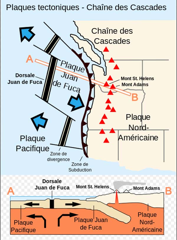 Le volcanisme et la sismicité le long de la Chaîne des Cascades dans l’ouest des États-Unis sont largement déterminés par la tectonique des plaques dans la région. La zone de subduction de Cascadia, de 1 000 kilomètres de long, qui n’a pas connu de puissant séisme depuis 1700, est l’endroit où la plaque océanique Juan de Fuca plonge sous la plaque continentale nord-américaine. Cette zone de faille s’étend depuis le nord de l’île de Vancouver jusqu’au Cap Mendocino dans le nord de la Californie.