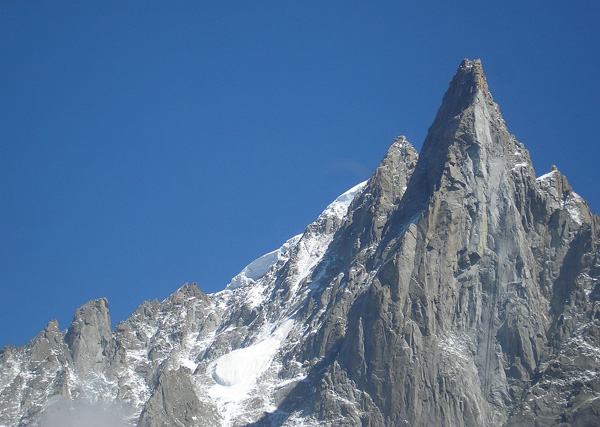 La face ouest des Drus en août 2005, après l’éboulement de juin qui a emporté le pilier Bonatti (Crédit photo : Wikipedia)