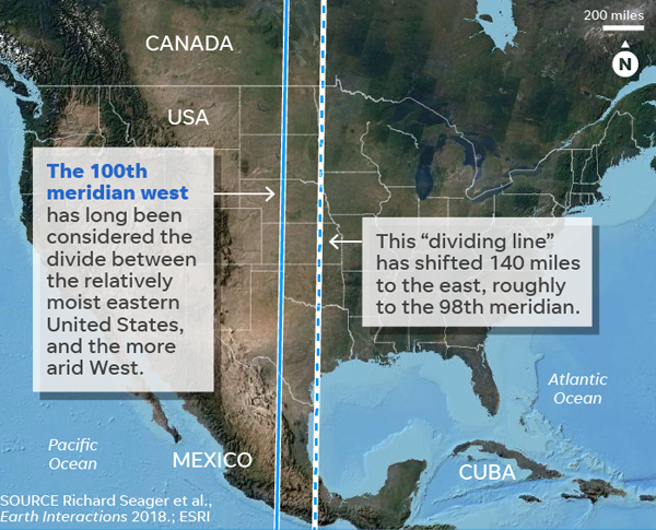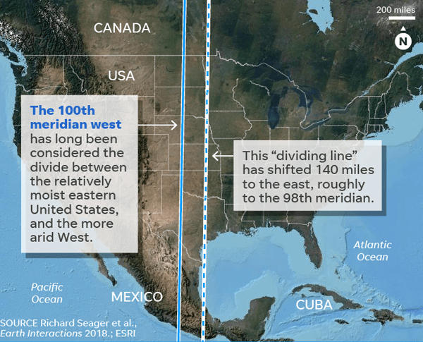 Maintenant, en raison des changements intervenus dans les précipitations, le vent et la température depuis les années 1870 – à cause du changement climatique induit par l’homme – la limite entre l’Ouest sec et l’Est plus humide s’est déplacée vers le 98ème méridien. Par exemple, au Texas, la ligne de partage climatique s’est déplacée d’Abilene à Fort Worth.