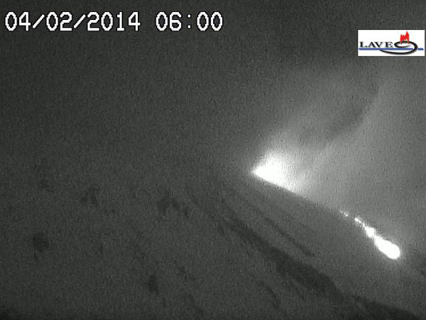 8 : 00 : As could be predicted with several increases in the tremor during the past weeks, Mount Etna’s SE Crater has become active again. Seismicity has been rising since about 22:00 last night and it seems the new paroxysm started at about 2:00 this morning. While I’m writing this note, vigorous lava fountains can be observed as well as a plume of ash and gas that rises vertically above the vent.