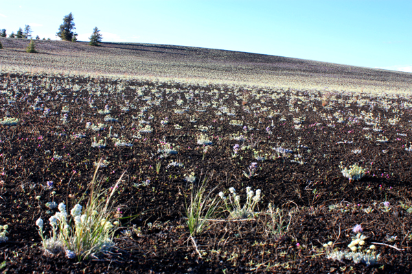 Aux Cratères de la Lune. Les formations de lave a’a avec leurs infractuosités et les tunnels sont un lieu de séjour et de reproduction parfait pour les pikas. La hausse des températures oblige les pikas à déménager car ils ont besoin d’environnements plus froids pour survivre.