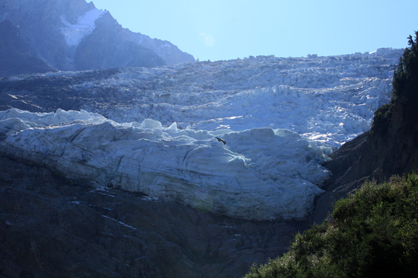 Si le danger d’une crue du lac des Bossons a été écarté grâce aux travaux qui viennent d’être réalisés, d’autres menaces pèsent sur la vallée à plus long terme. Ainsi, sur l’épaule de la montagne juste à côté de l’Aiguille du Midi, une masse de glace apparaît comme suspendue dans le ciel. C’est le glacier rond. Très affecté par la hausse des températures, ce glacier présente un risque notable pour les cordées d’alpinistes qui avancent quelques centaines de mètres plus bas. De gros séracs pourraient s’effondrer du glacier et emporter une cordée.