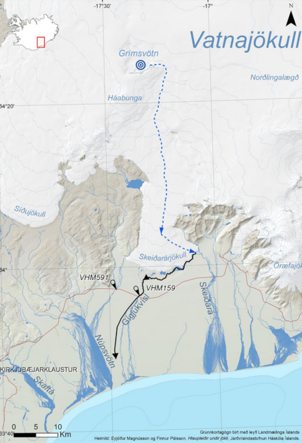 Selon le Met Office islandais, la crue glaciaire du Grímsvötn (Islande) que j’évoquais dans ma dernière note continue. On estime que le débit de l’eau provenant du volcan sous-glaciaire est supérieur à 350 m3 par seconde.