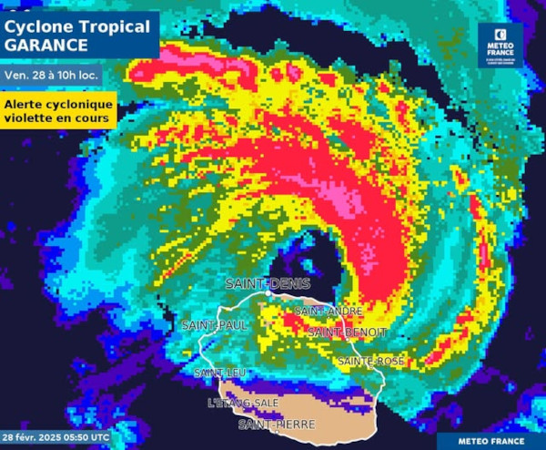 Avant l’arrivée de Garance en février 2025, l’île de la Réunion avait déjà été placée en alerte violette, niveau ultime, en janvier 2024 à l’approche du cyclone Belal qui a provoqué sur l’île la mort de quatre personnes et des dégâts matériels estimés à 100 millions d’euros par les assureurs.