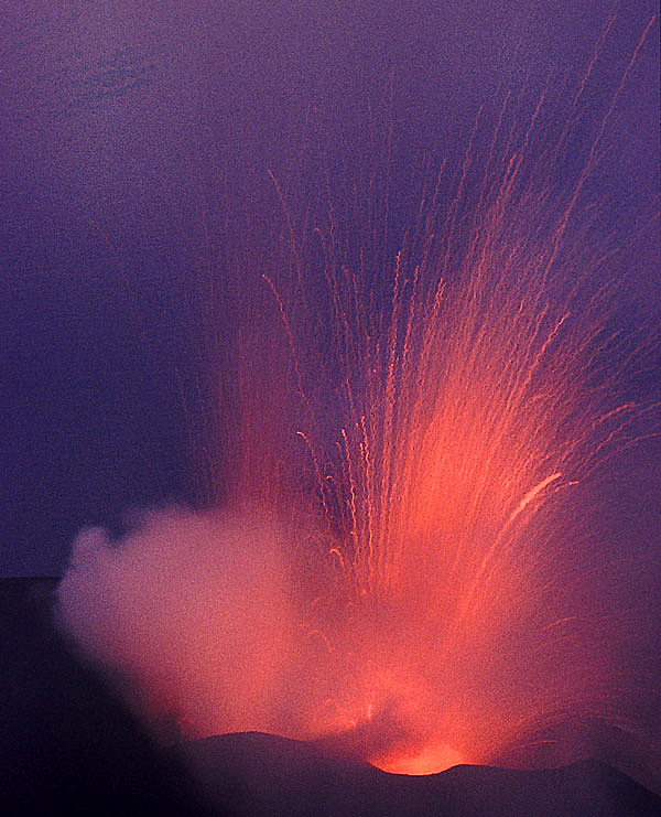 Il n’y avait personne sur le sommet du volcan et je ne pouvais donc pas faire d’envieux. Le risque serait le mien et le mien seulement. J’attendis que le volcan éructe et envoie dans le ciel son habituel nuage de cendres. J’enfilai mon Goretex et ajustai mon casque pour me protéger des éventuelles projections de lapilli ; je pris mon appareil photo et amorçai la descente vers le cratère ouest. Je ne rencontrai aucune difficulté. C’était même trop facile. Un enfant aurait réussi à effectuer ce court trajet. Au fur et à mesure que j’approchais du gouffre, les bombes en bouse de vache, vieilles de quelques jours seulement, se faisaient de plus en plus nombreuses, me rappelant qu’il faudrait tout de même être vigilant. L’odeur typique des gaz magmatiques, qui déclenche un picotement dans les narines, me fit frissonner. Je sentais mon cœur battre dans ma poitrine ; d’une part, je vivais un moment probablement unique dans ma vie, mais d’autre part, j’étais à la merci des caprices du volcan.