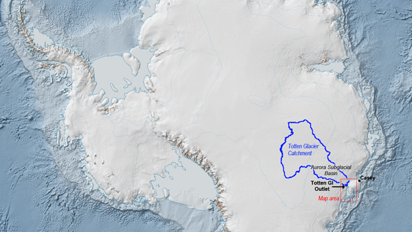 Chaque été, un avion australien parcourt l’Antarctique dans tous les sens pour observer la glace en utilisant un radar ainsi que des capteurs gravitationnels et magnétiques. Les vols ont révélé un paysage extrêmement spectaculaire sous la calotte de glace. Les résultats préliminaires des survols effectués en janvier 2017 ont confirmé l’existence d’un canyon de 1100 kilomètres, presque aussi profond que le Grand Canyon aux États-Unis. L’équipe scientifique a également découvert des fosses sous-marines qui s’étendent depuis le front du glacier Totten jusqu’à sa ligne de mise à la terre 125 kilomètres à l’intérieur des terres et à 2,7 kilomètres au-dessous du niveau de la mer. Un tel paysage facilite probablement l’arrivée des eaux chaudes océaniques qui viennent éroder rapidement la glace.