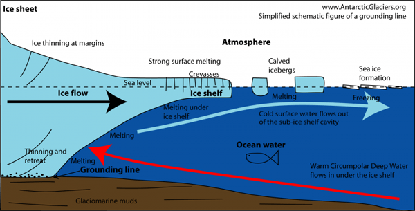 Researchers are now trying to gather as much information as possible about East Antarctica to better predict what is to come. Their concern is that over the next few centuries, the ice sheet there might reach a tipping point. Already in 2013, a scientific team detailed the behaviour of ice around the margin of Antarctica by combining satellite imagery, airborne surveys and climate models. The researchers found evidence that six East Antarctic ice shelves, including Totten, were melting from below at rates much higher than expected. More surprises emerged when the researchers took a closer look at some of East Antarctic glaciers. Satellite imagery and airborne surveys between 1996 and 2013 showed that the surface of the Totten glacier dropped by 12 metres and that its grounding line—the point at which the ice flowing off the continent begins to float on the ocean—retreated inland by up to 3 kilometres.