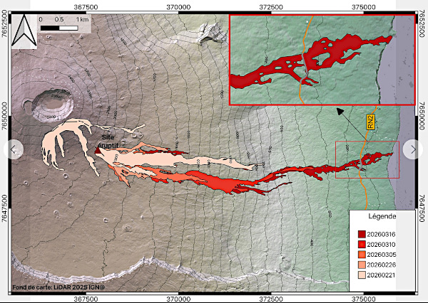 The eruption of Piton de la Fournaise (Réunion Island), which began on February 13, 2026, continues. Only one eruptive site remains active on the south-southeast flank of the volcano. The lava field still has two main branches. The front of the northern branch remains stationary approximately 2.6 km from the RN2 highway, at an altitude of about 660 m. The southern branch has split into several secondary branches that continue their advance at highly variable speeds due to the topography and vegetation.