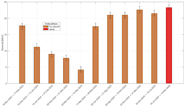 More than 23 million cubic meters of magma have accumulated beneath the Svartsengi volcanic system (Iceland) since the July 2025 eruption. Monitoring data released March 17, 2026, by the Icelandic Met Office show this is the largest magma accumulation between eruptions since activity began on the Sundhnúksgígar crater row in December 2023.