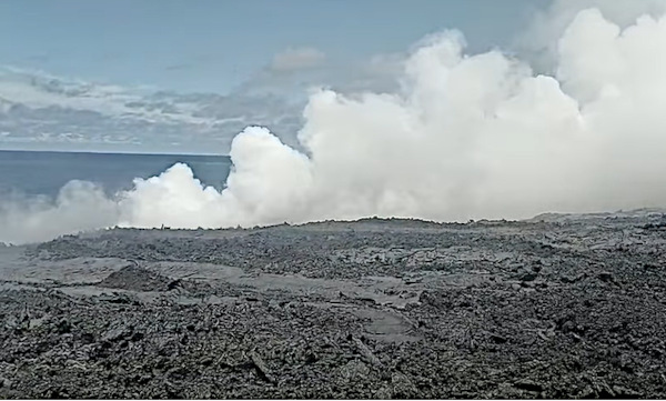 Au point de contact entre la lave et l’océan, une plateforme continue de se constituer et de s’élargir. Plusieurs bras secondaires se forment en aval de la RN2 avant l’arrivée en mer de la coulée.