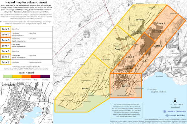 The Met Office has issued an updated hazard assessment map (valid from February 20th, 2024) following the decision of the National Police to repeal the order of a temporary evacuation from Grindavík, taking effect on February 19th, 2024, and due to the decision of the Police in Suðurnes regarding changes in access restrictions to the town (see my post of February 20th).