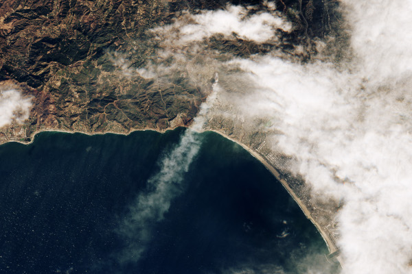Image satellite de la fumée émise par les incendies de Los Angeles le 7 janvier 2025 (Source : NASA)