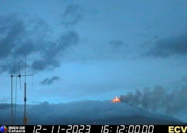 While an eruption is expected in Iceland, Mt Etna went through an eruptive episode during the afternoon of November 12th. INGV indicates that according to the analysis of images from the surveillance camera network, a lava fountain gushed from the South-East Crater, with an eruptive column whose height was estimated at around 4,500 m above sea level, before drifting East South East. The event was accompanied by an increase in the volcanic tremor, but the infrasound parameters do not show significant variations. The summit tiltmeters show minimal variations of less than 0.3 microradians, in relation to the ongoing phenomenology. The other tiltmeters do not show significant variations.