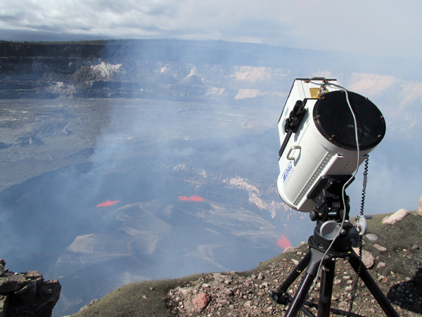 Sur le Kilauea, c’est le travail de l’Hawaiian Volcano Observatory (HVO) d’effectuer ces analyses. Pour réaliser les mesures, les scientifiques de l’Observatoire utilisent un spectromètre infrarouge à transformée de Fourier (IRTF ou FTIR pour Fourier Transform InfraRed spectroscopy). Ce type de spectromètre détecte le rayonnement infrarouge (IR) entrant ; c’est le type de rayonnement associé aux objets chauds ou tièdes qui ont des longueurs d’onde légèrement plus longues que la lumière visible que perçoivent les yeux.
