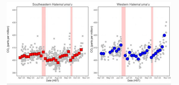 Au lieu d’utiliser toutes les données CO2 de la station multi-GAZ, le HVO ne prend en compte que les données CO2 qui atteignent la station depuis certaines directions et certaines vitesses de vent. Cela permet d’essayer d’isoler le signal CO2 volcanique. Les scientifiques calculent des moyennes hebdomadaires de concentration de CO2. Une fois ce travail effectué, en examinant uniquement les données provenant de deux secteurs de Halema’uma’u (secteurs ouest et sud-est du cratère) avec des vitesses de vent modérées, ils obtiennent des tendances dans la concentration du CO2 en relation avec les récentes éruptions sommitales. En observant les données concernant ces deux directions du vent, les scientifiques ont pu constater que le CO2 semblait augmenter lentement et légèrement avant les éruptions sommitales du Kīlauea en juin et septembre. Après ces éruptions, les concentrations de CO2 ont chuté..