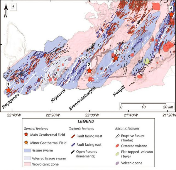 Compte tenu de la situation éruptive actuelle sur la Péninsule de Reykjanes et de l’ouverture de plusieurs fissures éruptives, il est intéressant de jeter un œil aux cartes géologiques de la région. J’en ai choisi deux proposées par Dominik Pałgan du Département de géophysique de l’Institut d’océanographie de l’Université de Gdansk.