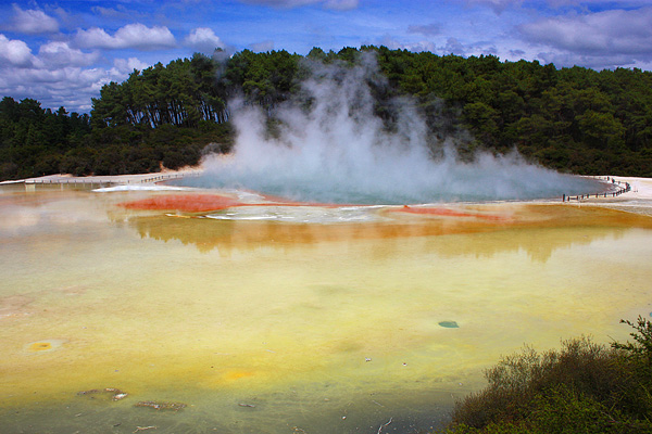 Le champ géothermique de Rotorua, qui a probablement été actif pendant des dizaines de milliers d’années, frémit sous une grande partie de la ville et de la bordure méridionale du Lac Rotorua qui s’est formé à l’intérieur d’une vaste caldeira, suite à une éruption il y a 240 000 ans. Le champ fait partie de la zone volcanique de Taupo.
