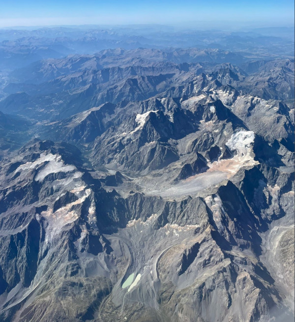 Le massif des Écrins, avec son Glacier Blanc et les quatre sommets du Mont Pelvoux, a perdu la quasi-totalité de son manteau neigeux et glaciaire. Les records de chaleur enregistrés au cours de l’été 2022, même en altitude, n’ont fait qu’aggraver la situation. Seules quelques neiges éternelles sur les faces nord des plus hauts sommets ou les lacs pro-glaciaires du glacier de l’Arsine, au premier plan de la photo, contrastent avec l’ensemble grisâtre du massif. Le sable qui avait été transporté par le vent depuis le Sahara, apparaît également sur la photo.