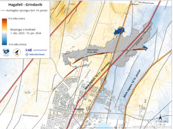 Des déplacements et des affaissements du sol sont observés là où le magma se rapproche de la surface. Ce phénomène a été constaté lors d’une campagne de mesures aériennes effectuée le 15 janvier au-dessus de la région de Grindavik. Sur une nouvelle carte publiée par le Met Office le 16 janvier 2024, un nouveau graben – ou vallée d’affaissement – est visible à l’est de l’ancien graben du 10 novembre. Ce nouveau graben, d’une largeur de 800-1000 mètres avec un affaissement atteignant 30 centimètres, s’étire dans la partie orientale de la ville, vers le sud et jusqu’à la mer. L’éruption du 14 janvier s’est produite à l’ouest de ce graben.