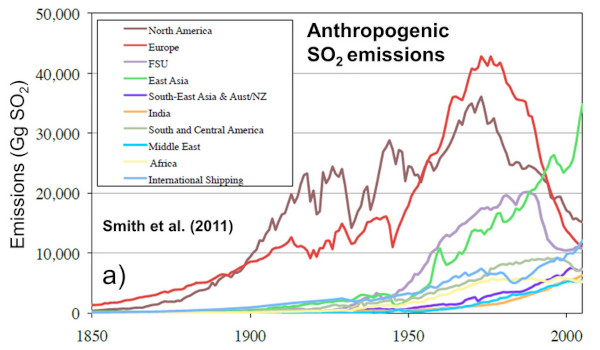 Graphique montrant l’évolution des émissions de SO2 anthropiques par région. (Source : Smith et Al. (2011)