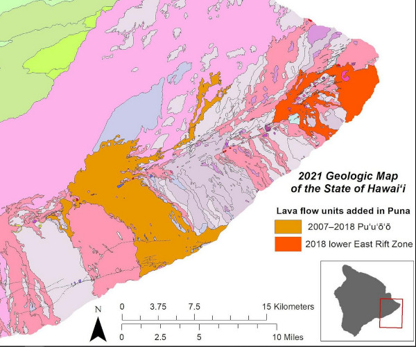 A new geologic map of the State of Hawaii in 2021, updated from a preliminary 2007 version, includes the early mapping of the 1940s, the 1996 geologic map of the Island of Hawaiʻi, new mapping of East Maui, West Oʻahu and West Molokaʻi volcanoes, and the Halemaʻumaʻu overflows and Puna lava flows of 2018.