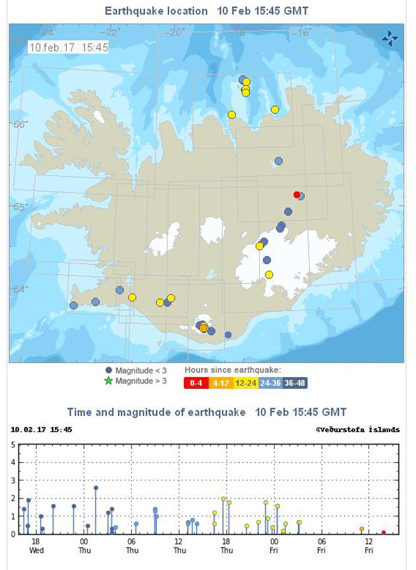 Here is a map showing the current volcanic activity in Iceland, with very few events on the volcanoes mentioned by Páll Einarsson.