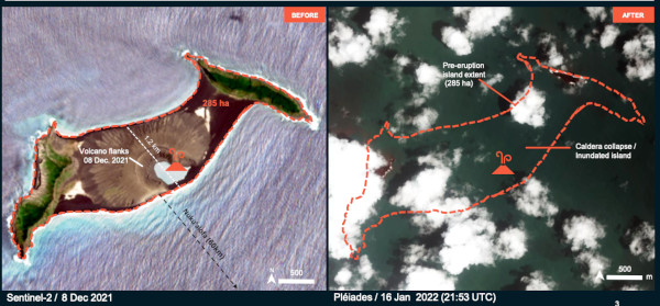Une puissante éruption a de nouveau eu lieu sur le volcan Hunga Tonga-Hunga Ha’apai le 15 janvier 2022. Le panache de cendre et de gaz s’est élevé à environ 16,7 km au-dessus du niveau de la mer, selon le VAAC de Wellington. Il s’est étendu de manière concentrique sur une distance d’environ 130 km par rapport au volcan, créant un panache de 260 km de diamètre. Selon le service géologique des Tonga, l’éruption a duré plus de 12 heures. C’est la plus importante observée depuis décembre 2021.