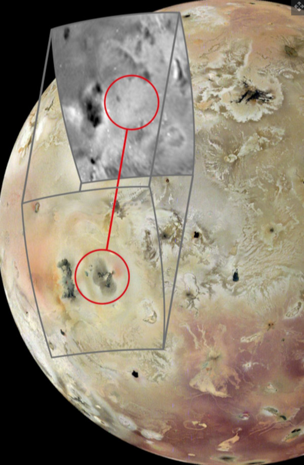 Grâce à l’instrument Jovian Infrared Auroral Mapper (JIRAM) à bord de Juno, les scientifiques ont découvert une région de Io jusqu’alors inconnue et soumise à un volcanisme extrême sur 100 000 kilomètres carrés. Le JIRAM a détecté un événement de rayonnement infrarouge extrême dans l’hémisphère sud de Io ; il était si fort qu’il a saturé le détecteur. Cependant, les scientifiques ont la preuve qu’il s’agit de plusieurs points chauds rapprochés ayant émis le rayonnement en même temps. Cela laisse supposer la présence d’un vaste système de chambres magmatiques sous la surface de Io. Les données confirment qu’il s’agit de l’éruption volcanique la plus intense jamais enregistrée sur Io.