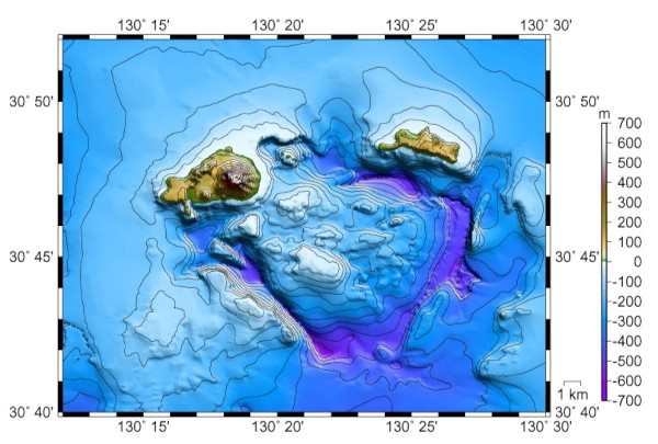 Vue de la caldeira de Kikai, avec le cône du Satsuma-Iwojima au NO de la caldeira (Source : Garde-côtière japonaise)