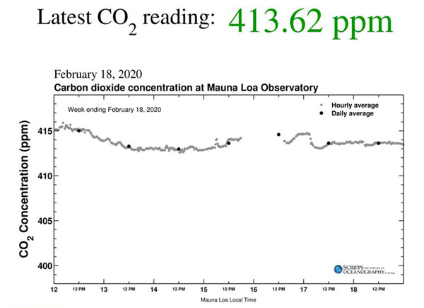 Concentrations de CO2 au sommet du Mauna Loa (Hawaii) le 18 février 2020 (Source: Scripps Institution)