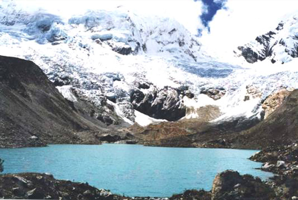 Glacier Shishpar et lac de fonte, en vert au milieu de la photo (Source: NASA)