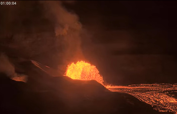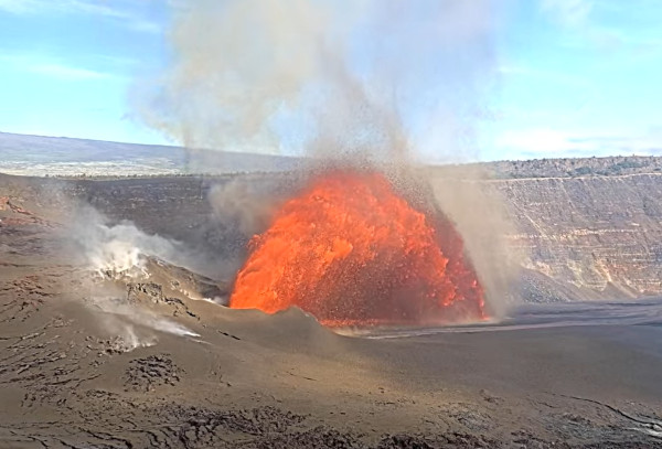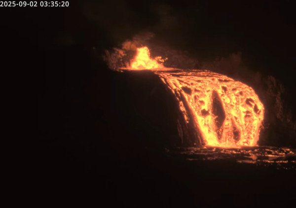 2 septembre 2025 (19h30, heure locale) – 3 septembre 2025 (07h30, heure française).  Cela fait plus de 13 heures que les fontaines de lave jaillissent de la bouche éruptive nord dans le cratère de l’Halema’uma’u et l’activité ne semble pas faiblir. On sait toutefois, au vu des épisodes précédents, qu’elle peut cesser brutalement. En attendant, on profite du spectacle grâce aux webcams judicieusement installées dans le cratère…