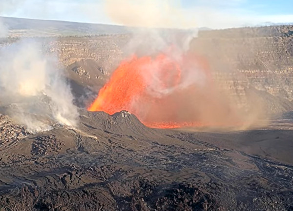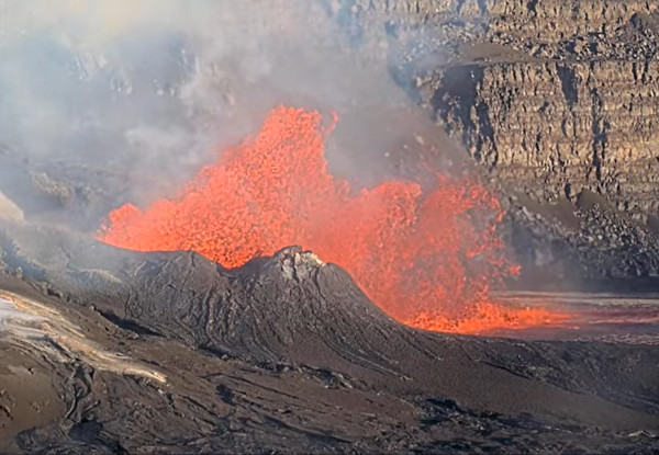 It’s now daylight in Hawaii. Lava has been erupting from the two vents in Halema’uma’u’s crater for about seven hours. The dhow is as mesmerizing as ever.