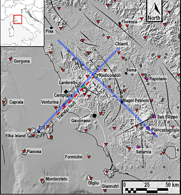 Une étude par une équipe italo-suisse, publiée dans la revue Communications Earth & Environment, vient de révéler que la Toscane cache sous ses magnifique paysages de vastes réservoirs de magma. Ce n’est pas vraiment une surprise car la province italienne est réputée pour sa géothermie dont la centrale de Larderello est le parfait exemple. Voir ma note du 24 septembre 2023 :