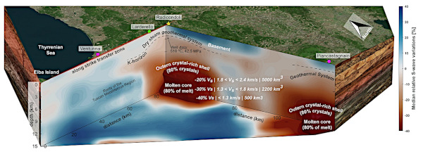 Thanks to ambient noise tomography, which allows for unprecedentedly precise analysis of natural ground vibrations, a team from the University of Geneva (UNIGE), the Institute of Geosciences and Earth Resources (CNR-IGG), and the National Institute of Geophysics and Volcanology (INGV) in Italy has identified a vast reservoir containing approximately 6,000 km³ of magma beneath Tuscany. Beyond the scientific achievement, this breakthrough paves the way for faster and less expensive exploration methods to locate resources such as geothermal reservoirs, lithium (highly sought after today), and rare earth elements, whose formation is closely linked to deep magma systems. In addition to its significant scientific interest, this study demonstrates that tomography, by exploring the subsurface quickly and at a lower cost, can be a valuable tool for the energy transition.