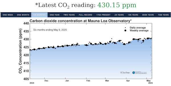 In 1958, when the Keeling Curve began, the concentration of CO2 in the Earth’s atmosphere was 313 parts per million. In 2024, that had risen to 424.61 ppm, and this year, monthly average CO2 levels at Mauna Loa exceeded 430 ppm for the first time. The last fifures of 1 July 2025 revael 429,29 ppm, which is a significant rise compared with 2024.