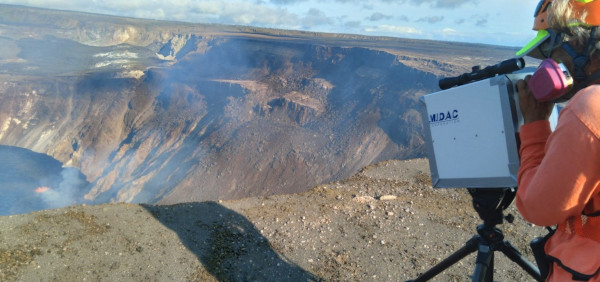 Un géochimiste du HVO mesure les gaz émis par le Kilauea à l’aide d’un spectromètre infrarouge à transformée de Fourier (FTIR), un instrument qui détecte la composition des gaz sur la base de la lumière infrarouge absorbée. (Crédit photo : HVO)