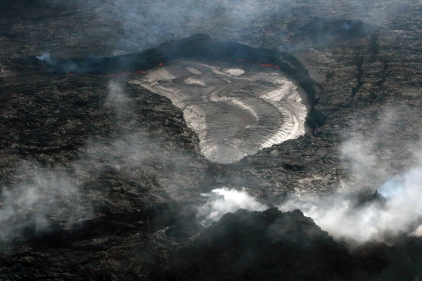 Le Kilauea (Hawaï) n’est toujours pas en éruption. La zone située juste au sud du sommet montre des signes d’activité épisodiques. Le HVO affirme qu’une éruption dans la zone entre le sud de l’Halema’uma’u et les bouches de l’éruption de décembre 1974 peut se déclencher avec peu de préavis (1 à 2 heures) pendant un des pics de cette activité. [NDLR : Heureusement, la zone est désertique et n’y a donc aucune menace pour des habitations].