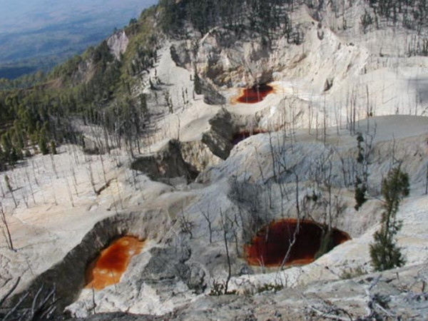 There were only two known eruptions at this volcano. The last one occurred in 2001, with several small craters whose bottom is occupied by temporary lakes with red water.